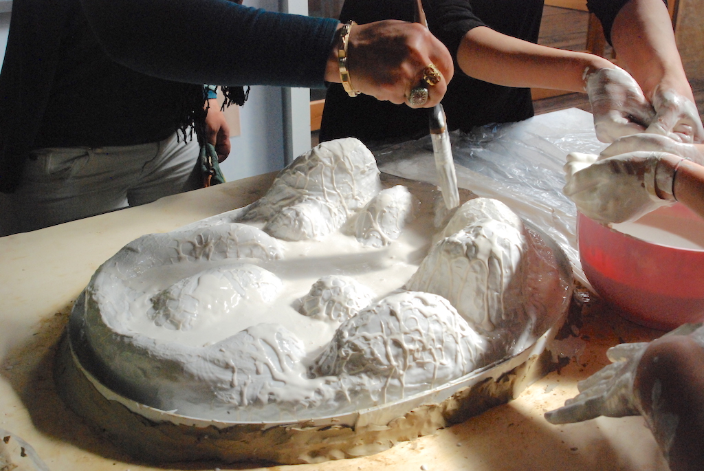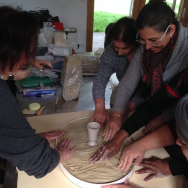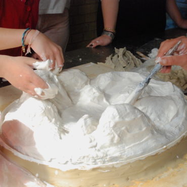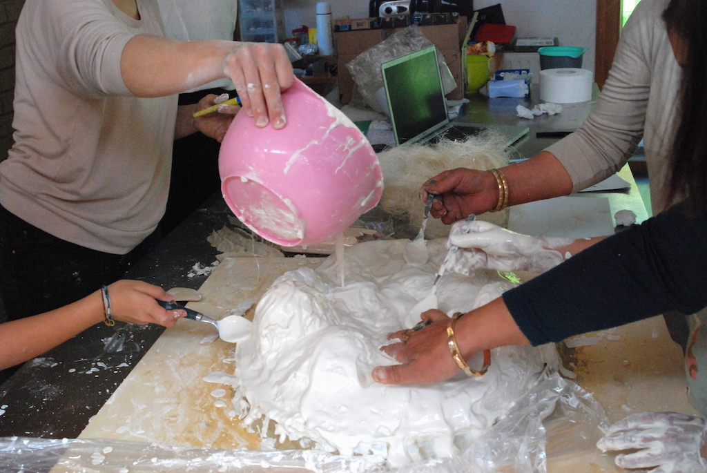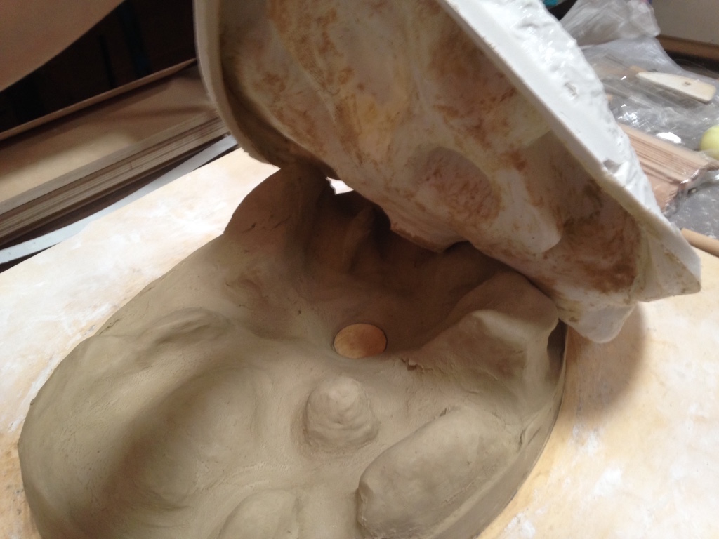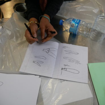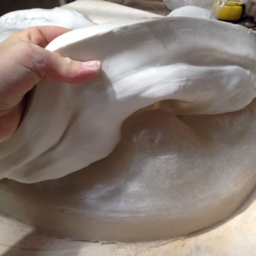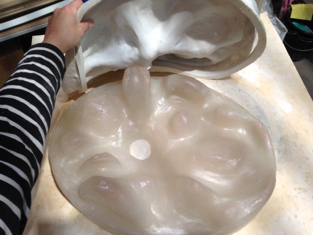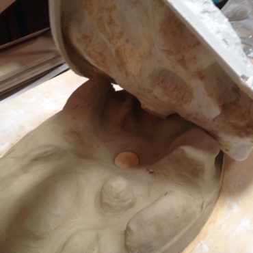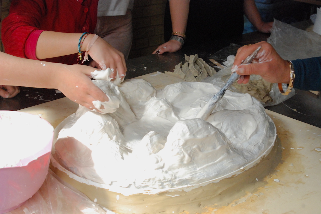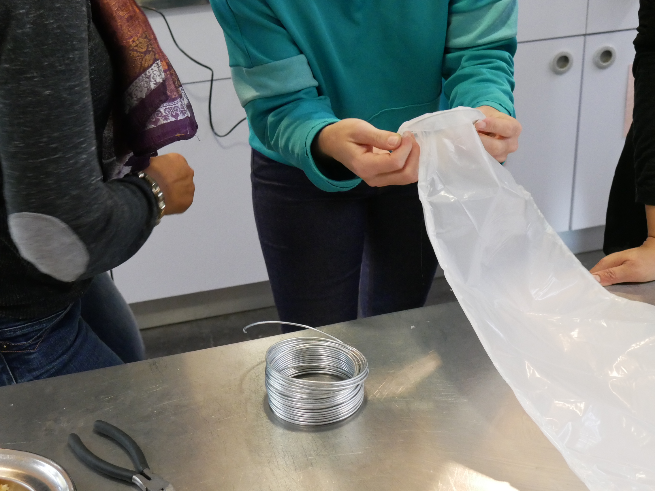 Suite de la fabrication du dispositif de ponte. Aujourd’hui, nous réalisons le moule du modèle en terre modelé la semaine précédente. On a déjà réalisé précédemment un moule-empreinte en silicone. En atelier, nous passons à la réalisation de la chape en plâtre qui servira à rigidifier le moule. Par la suite, nous ferons un tirage en résine de la forme.
