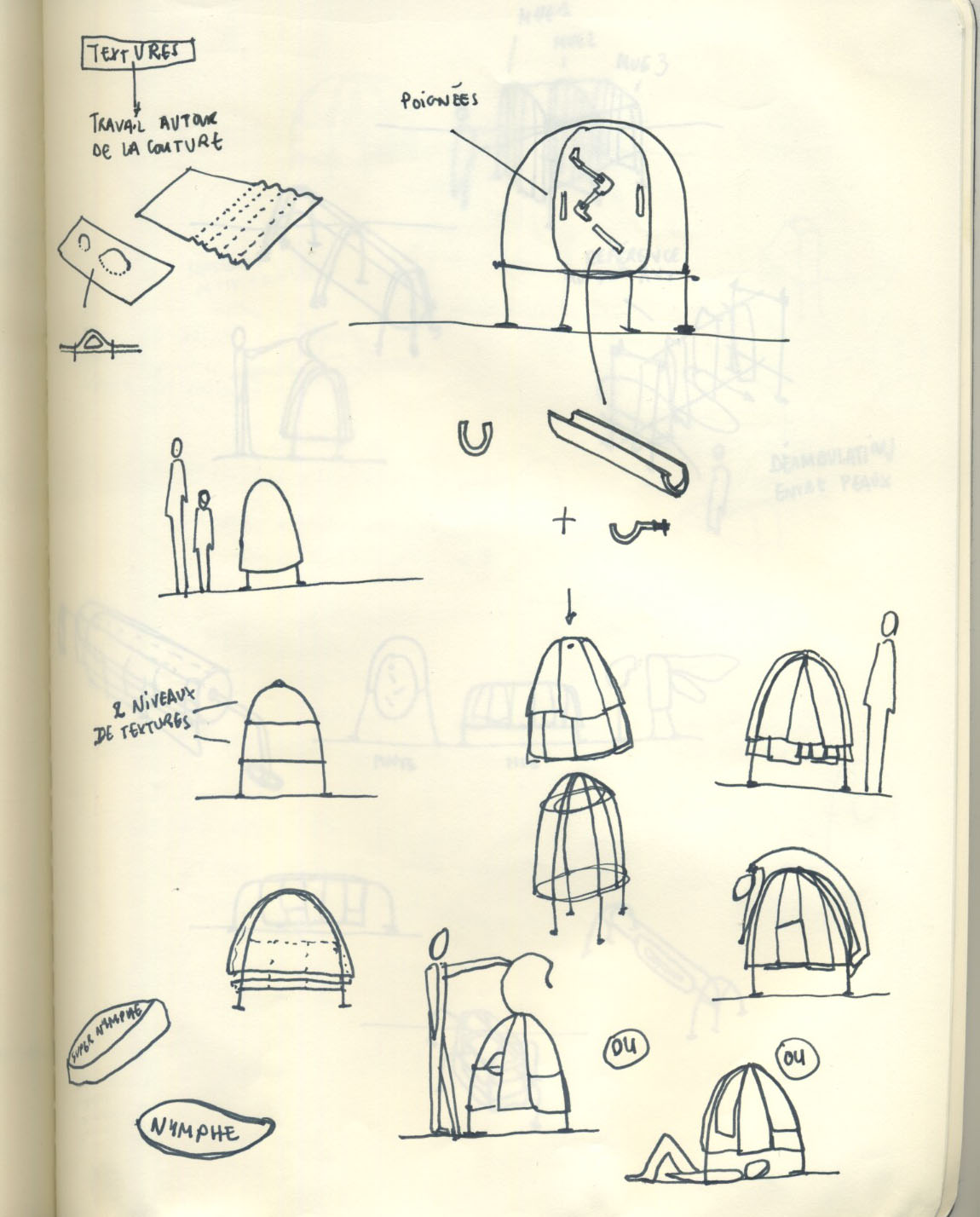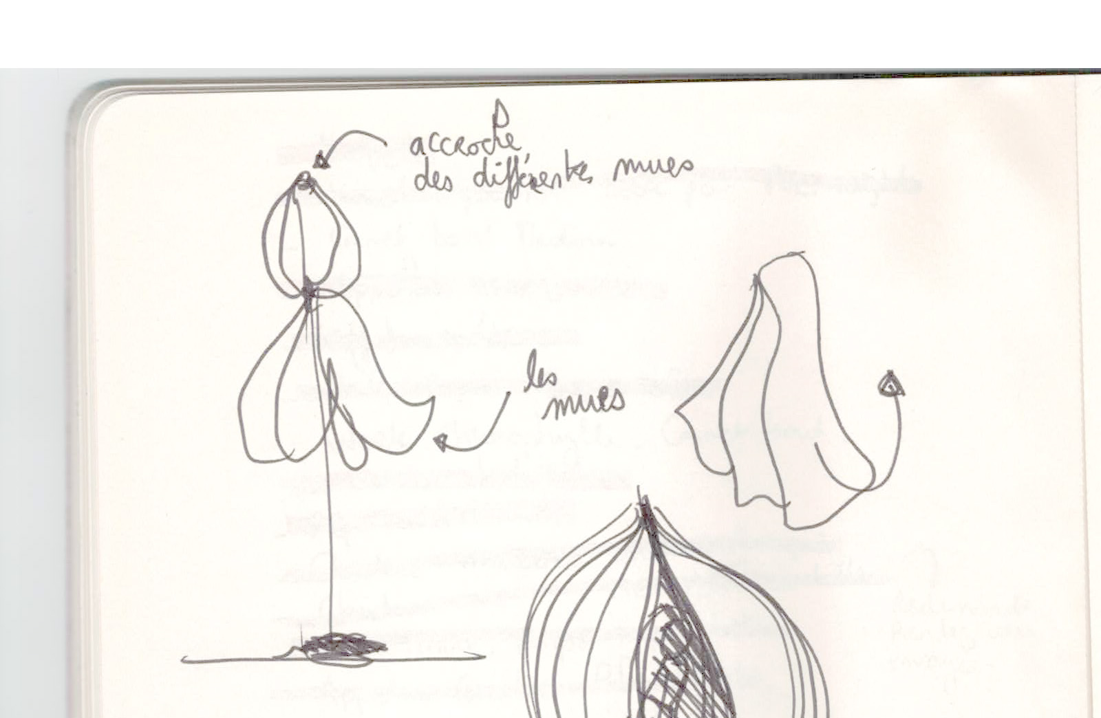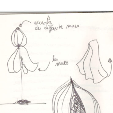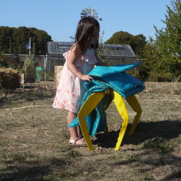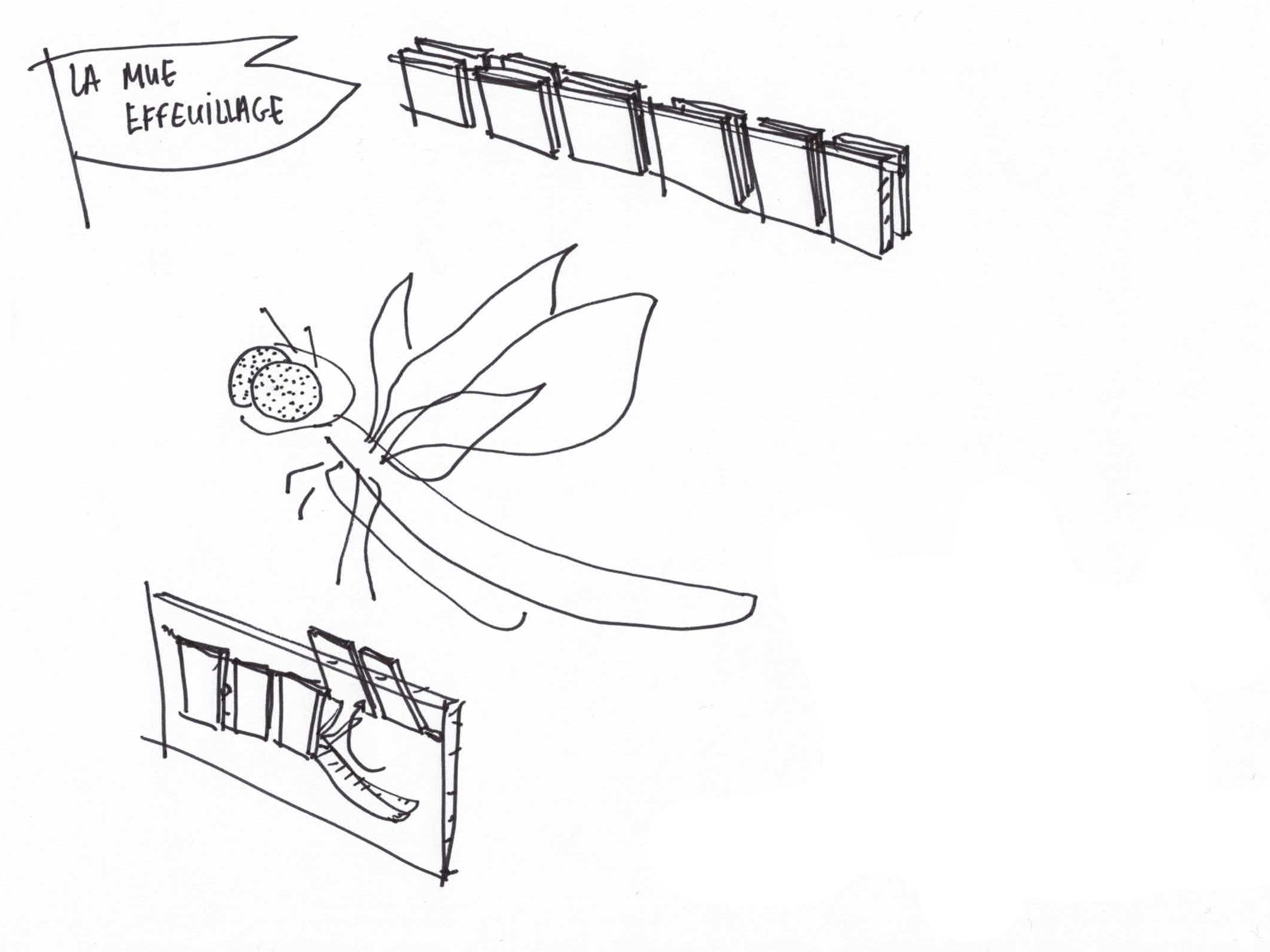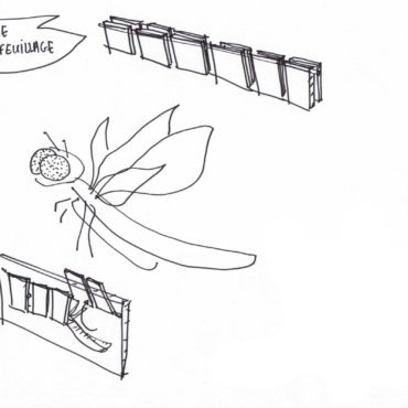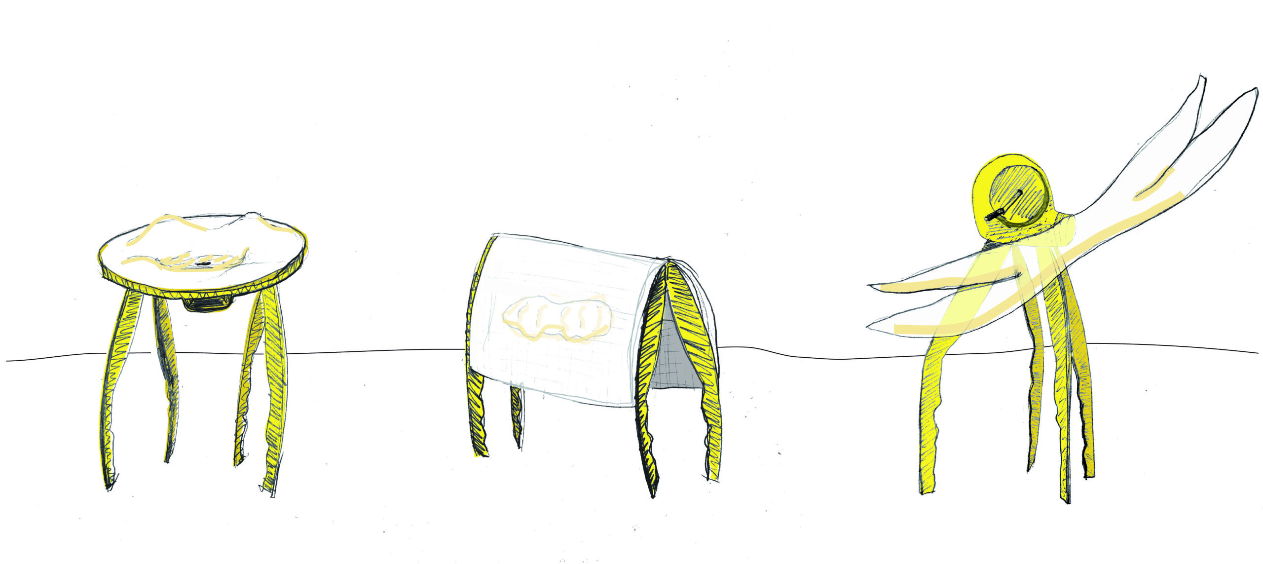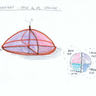 La libellule au stade larvaire mue successivement de 8 à 12 fois. Ces mues se font dans le milieu aquatique, sauf la dernière qui s’effectue hors de l’eau, au passage de la nymphe à l’insecte ailé. Le dispositif associé sera représenté par un objet à manipuler, à effeuiller. Différentes couches de textile, papier, et autres matériaux seront superposées et chacune offriront des textures nouvelles à découvrir.