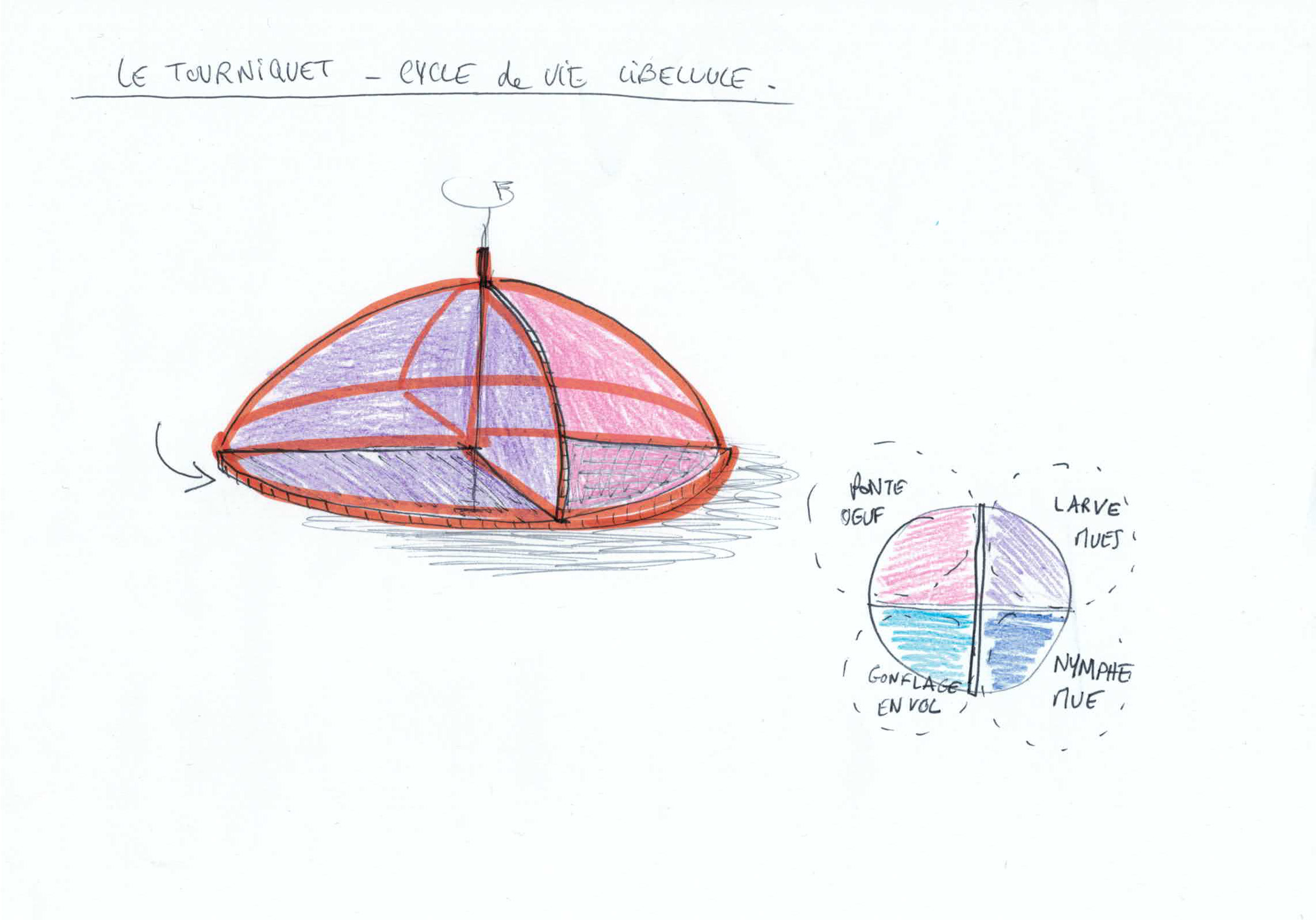 En sortant de sa dernière mue de nymphe, la libellule est enfin ailée, prête pour sa vie aérienne et pour la reproduction. Les premiers instants de sa vie hors de l’eau sont très délicats pour la survie de la libellule. En effet, fraichement sortie de sa mue, elle n’est pas encore capable de voler, elle doit d’abord se sécher et « gonfler » ses ailes. C’est cette étape de gonflage à laquelle fera allusion le troisième dispositif.
