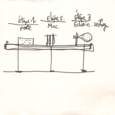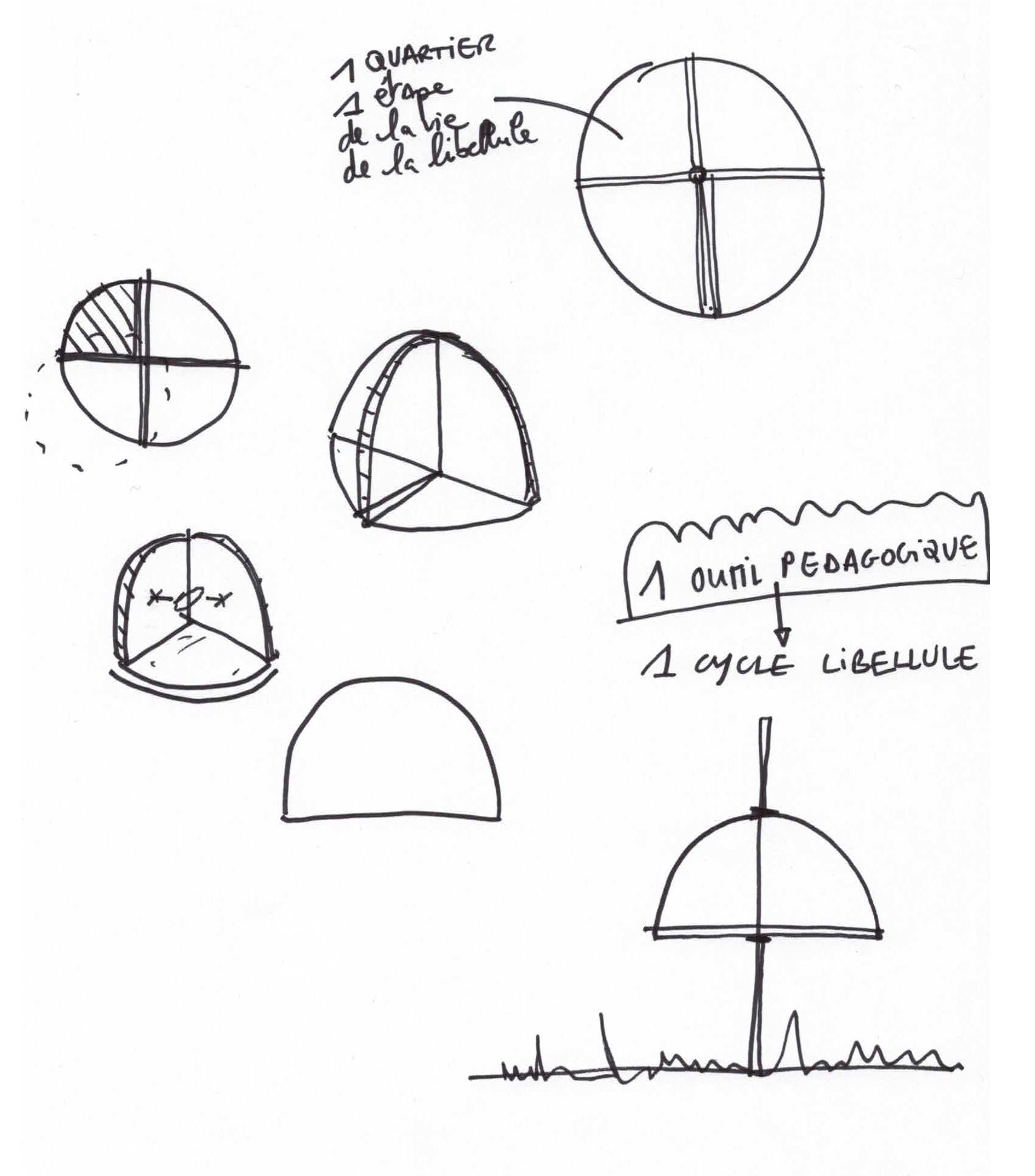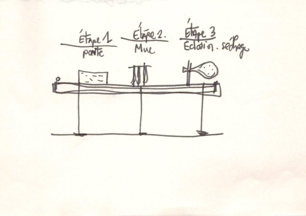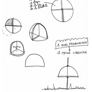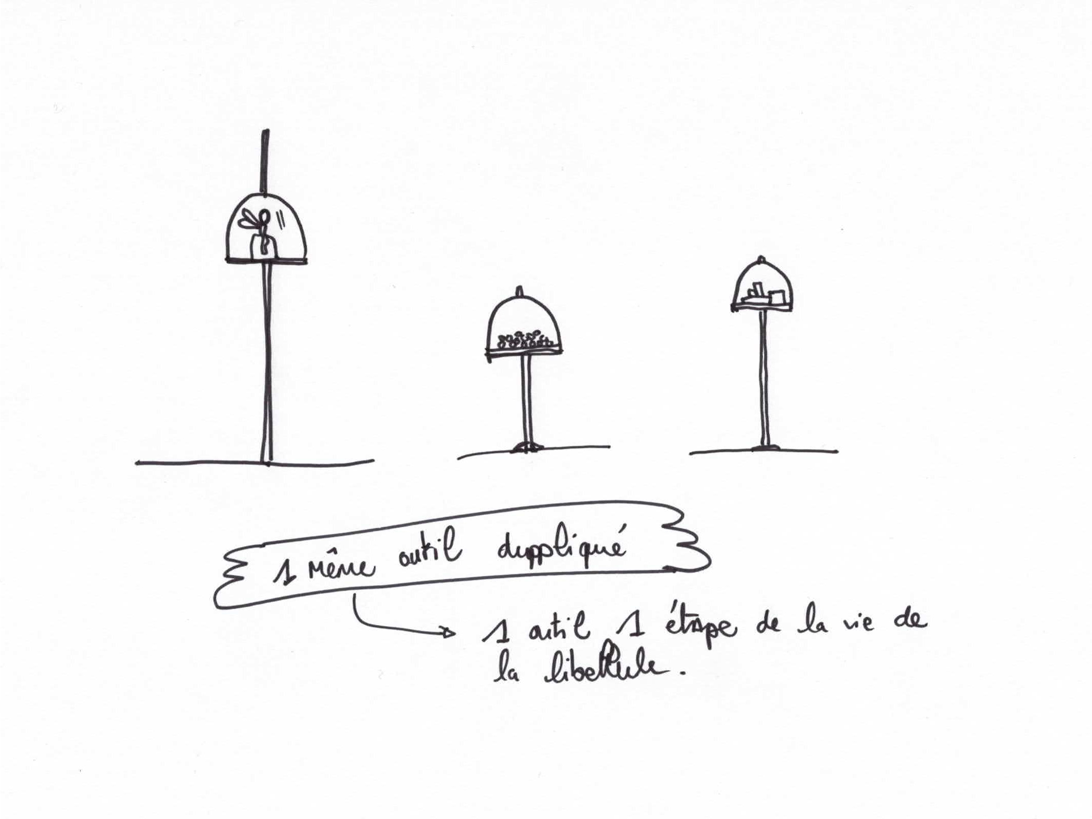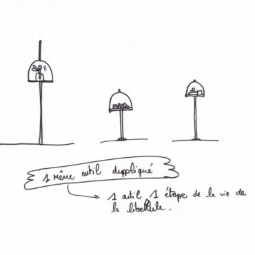 - Chaque dispositif reprend une étape, un évènement marquant du cycle de vie de la libellule. On a retenu : 1. la ponte, les oeufs / 2. la vie aquatique, larve, mues, nymphe / 3. la sortie de l’eau, le séchage des ailes, la vie aérienne.