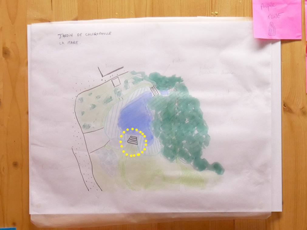 > Implantation des outils > On choisit de ne pas disposer les outils tout autour de la mare. Ne pas occuper tout le tour de la mare pour parler d’un seul animal (la libellule). On définit une zone d’implantation : l’observatoire qui dispose d’une terrasse en bois.