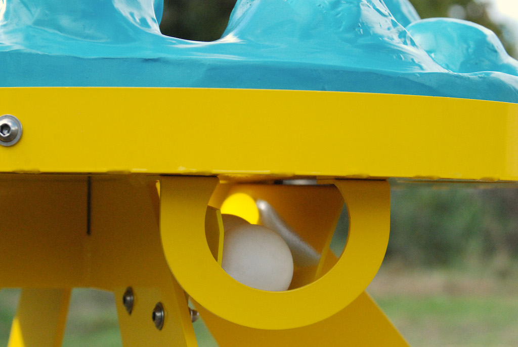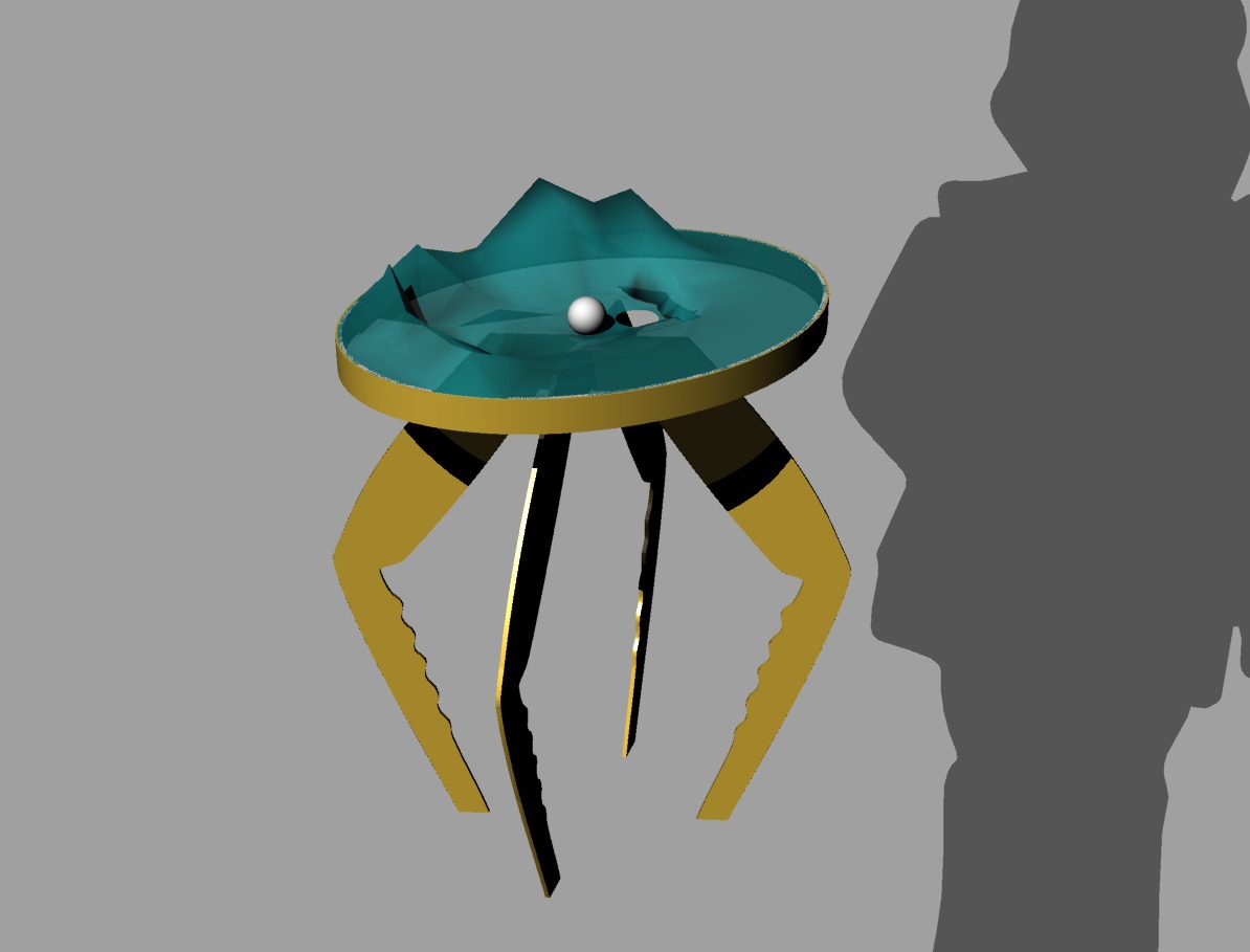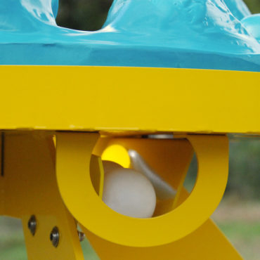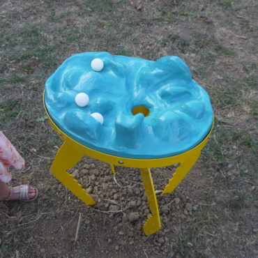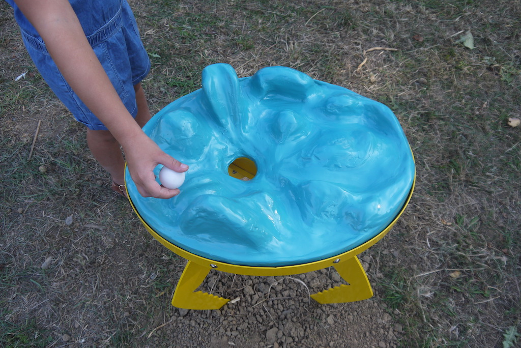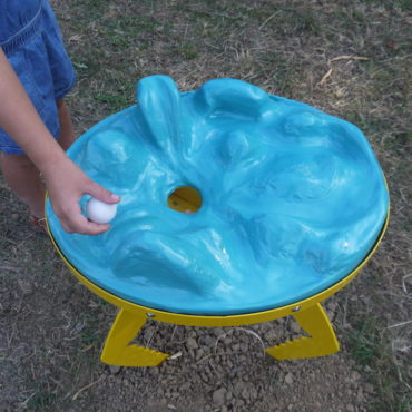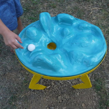 On a imaginé un jeu de manipulation de balles/billes dans un tableau/plateau vertical ou incliné, illustré. L’enfant pourrait placer les balles à différents endroits (surface de l’eau, végétaux, tiges) et la balle suivrait un parcours (sur des rails, une gouttière ou grâce à des guides) pour arriver jusqu’à une représentation de l’eau de la mare.