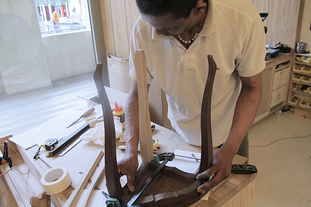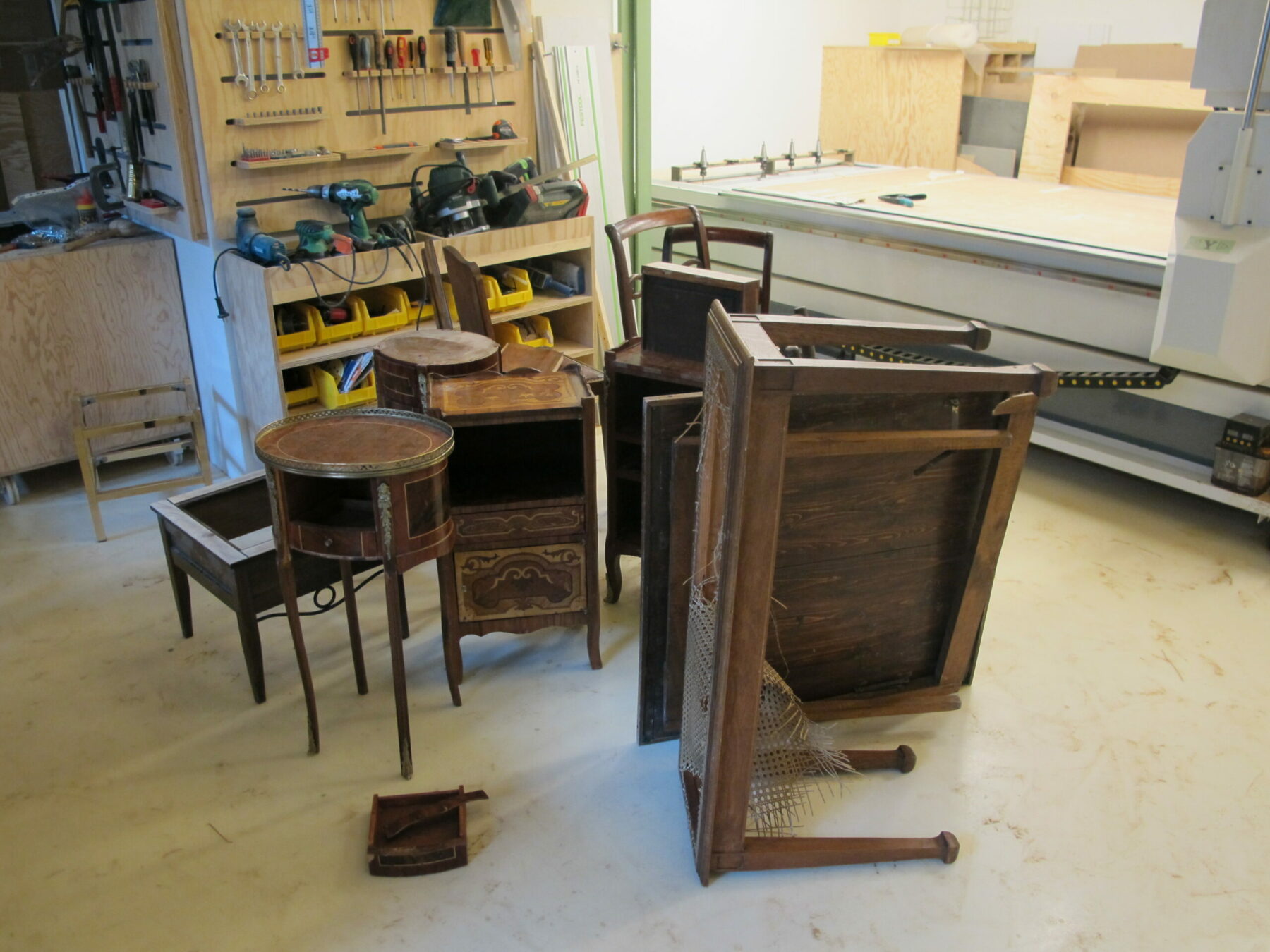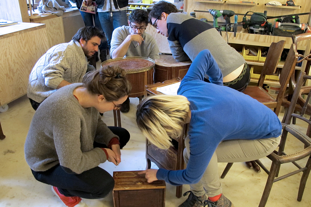 Le chantier a pris place au cœur de l'Unité, dans la cour. Au fil des jours, plusieurs postes et missions s'y sont succédé (découpe, ponçage, vitrification, assemblage, désossage et stockage des anciens meubles, documentation).
