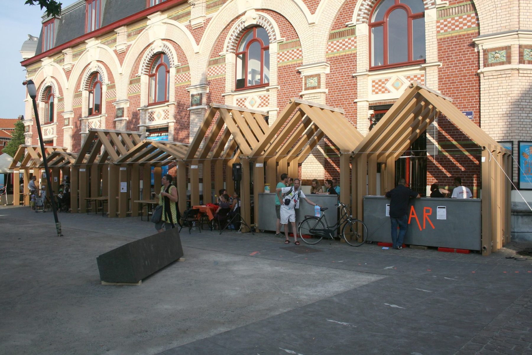 L’ensemble, érigé puis haubané, ponctue la place, propose un rythme visuel par la variation des cimes de chaque élément et propose des espaces d’activités aux associations participantes.