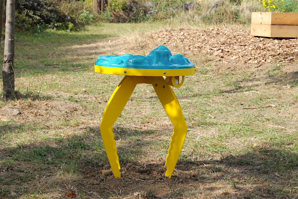 Nous avons dessiné un ensemble de trois dispositifs qui ponctuerait la mare du jardin. Chaque objet évoque une étape de la vie d’une libellule, animal emblématique du milieu humide.
