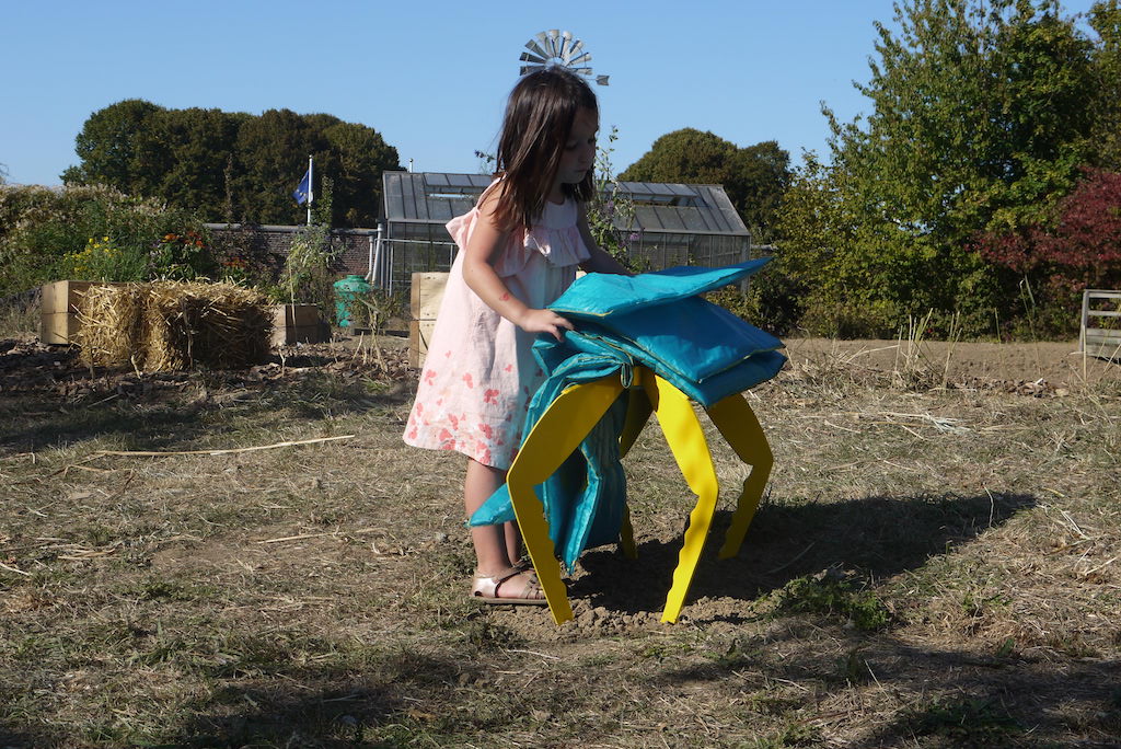 Nous proposons une découverte active grâce à des systèmes sollicitant la curiosité et la motricité des enfants. Ainsi, pour le stade de la ponte de l’oeuf, l’enfant manipule et déplace une balle, pour la mue il doit soulever et regarder une multitude de feuilles molletonnées, et pour l’envol il doit activer une manivelle pour gonfler une aile.