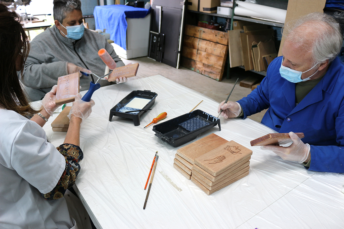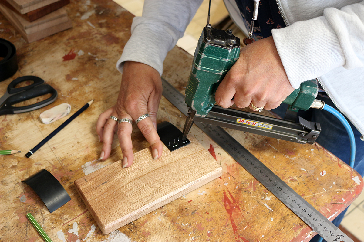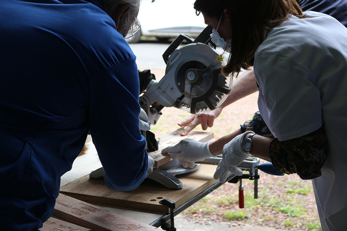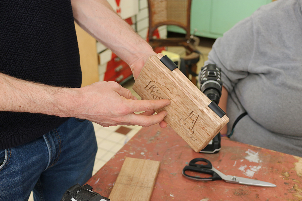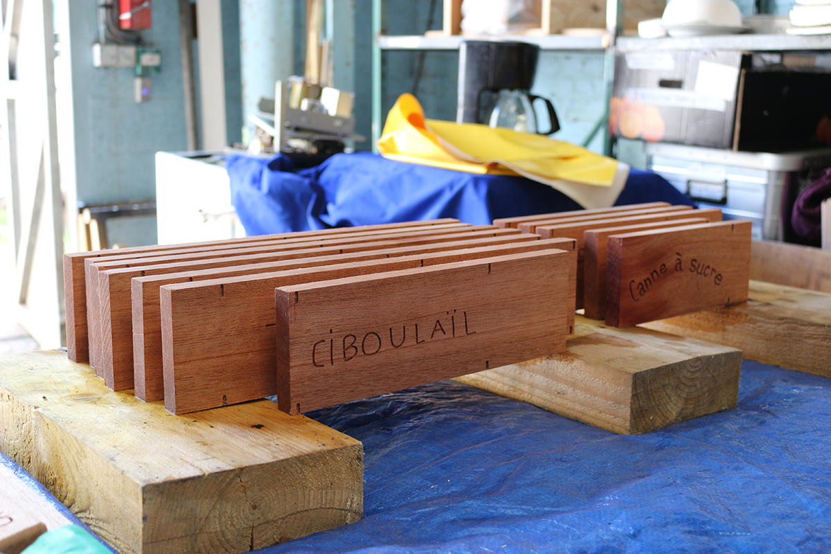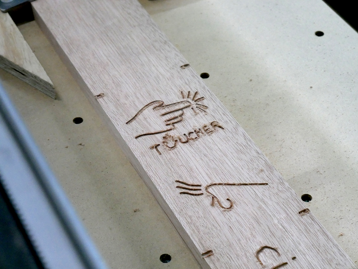 Par la suite, les noms des plantes et les sens qu’elles convoquent pour être identifiées (le goût, l’odorat et/ou le toucher) y ont été gravés grâce à La Fraise, notre outil de fabrication numérique mobile. Après le dessin et la gravure, les participants ont réalisé chaque étape de la fabrication: la découpe, le ponçage, la finition et l’assemblage.