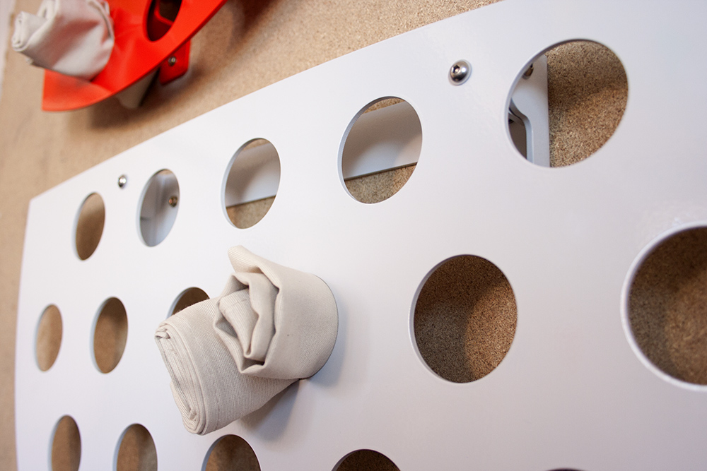 Lēon se compose d’une gamme de parois en métal perforé qui se fixe à distance du mur à l’aide de pattes métalliques. Les perforations rondes permettent le rangement des serviettes de table des enfants et des adolescents. Après avoir plié et roulé sa serviette, d’un geste simple, ils l’introduisent dans une des perforations.