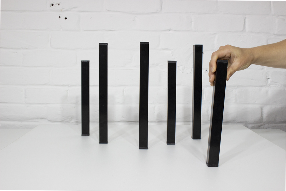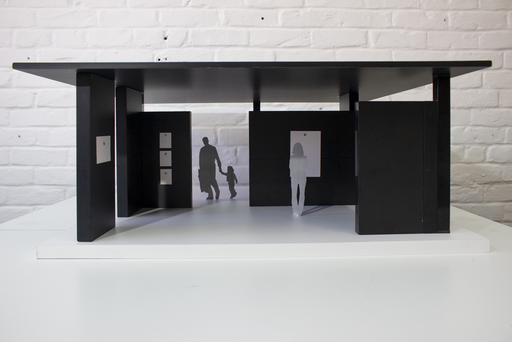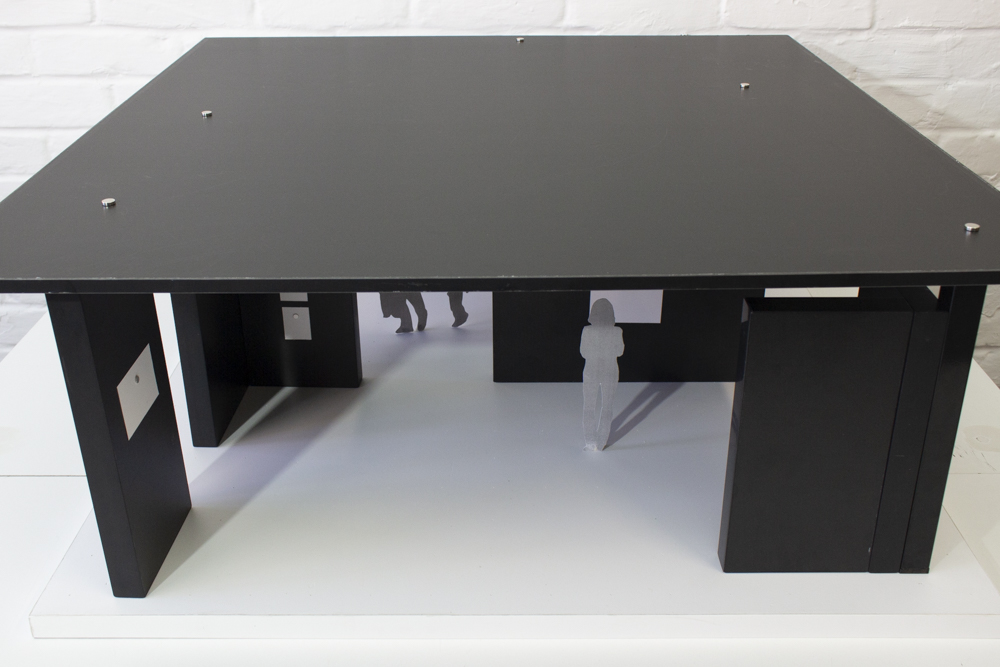 Le dispositif, à l’échelle 1:10, se compose d’un plateau, sur lequel viennent s’aimanter une dizaine de cimaises. L’ensemble est complété par un plafond et des poteaux. Grâce à son système d’aimantation, cet outil intuitif permet de composer les éléments de différentes manières et de positionner les reproductions d’œuvres. Des repères sur les cimaises et sur le plateau permettent de faciliter le positionnement des objets dans l’espace. Le public peut alors imaginer des espaces d’expositions réels ou fictifs.