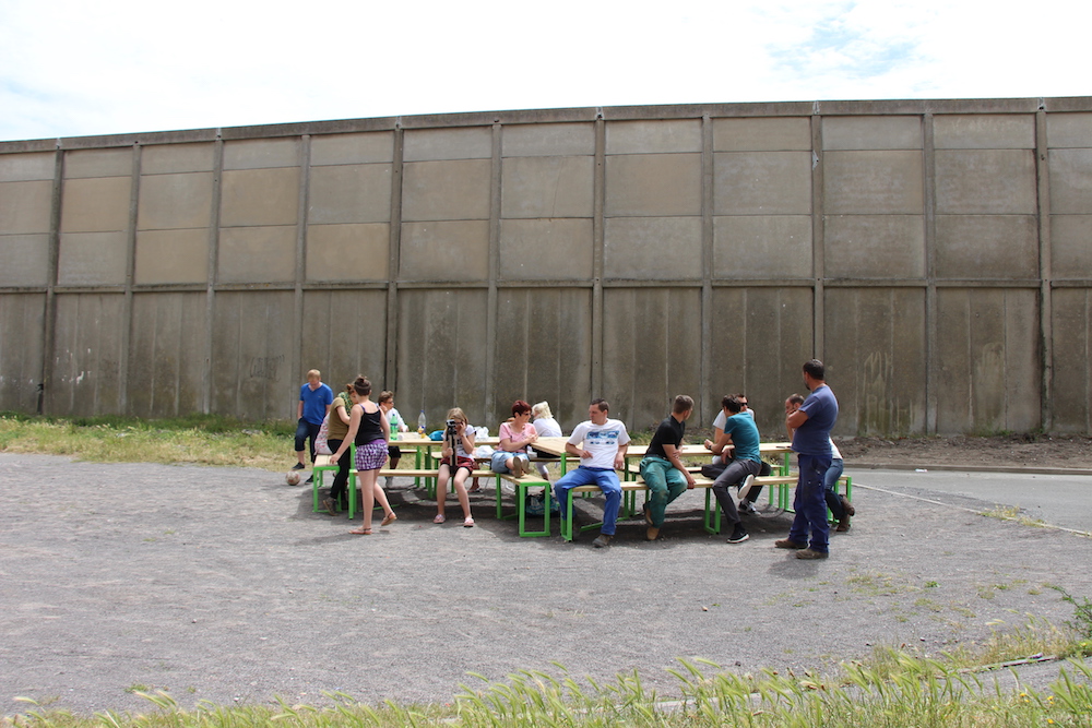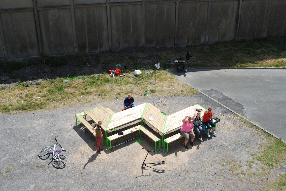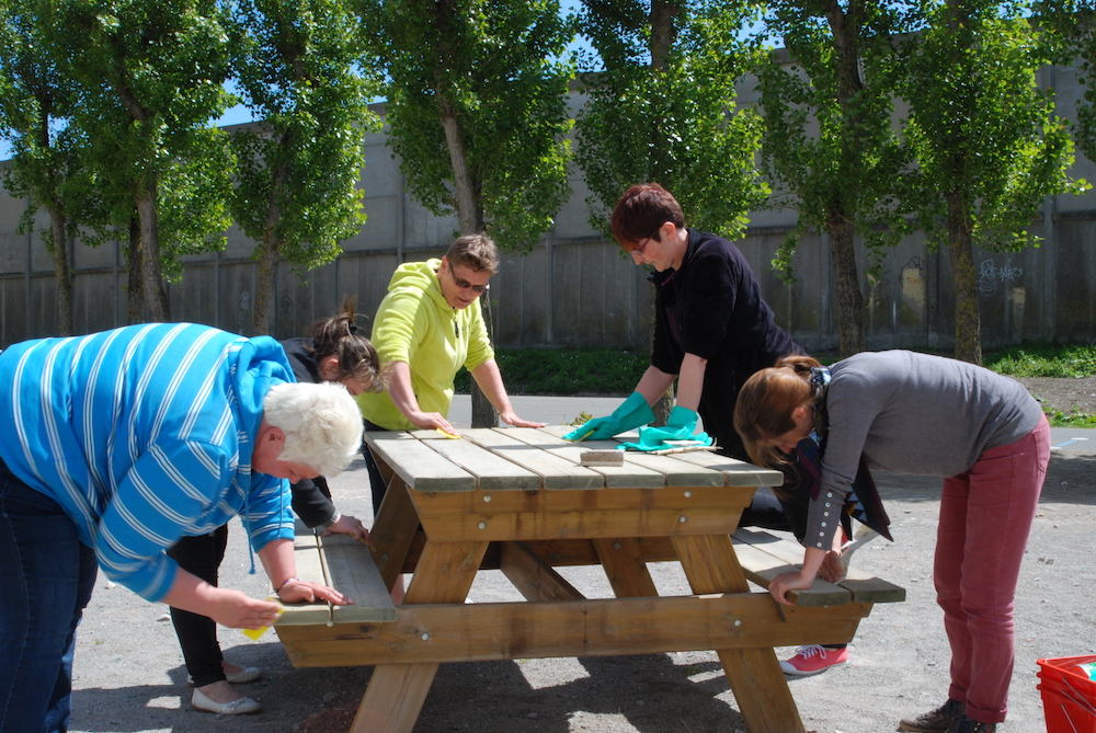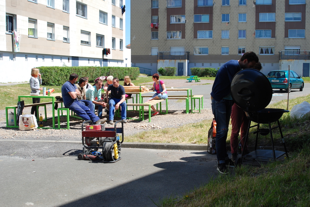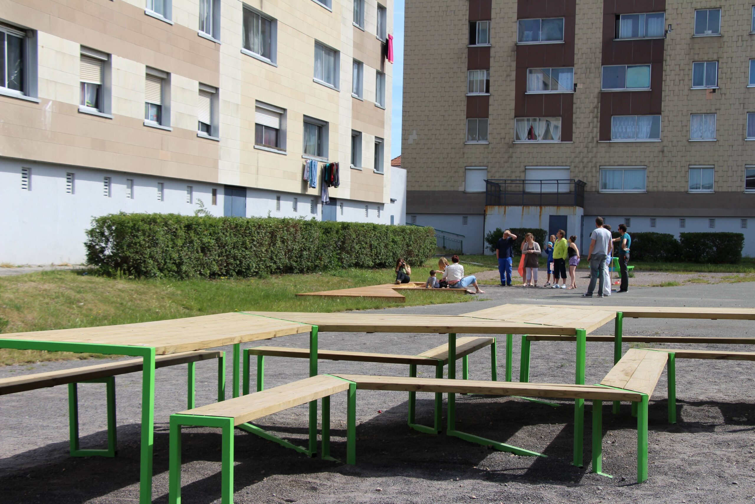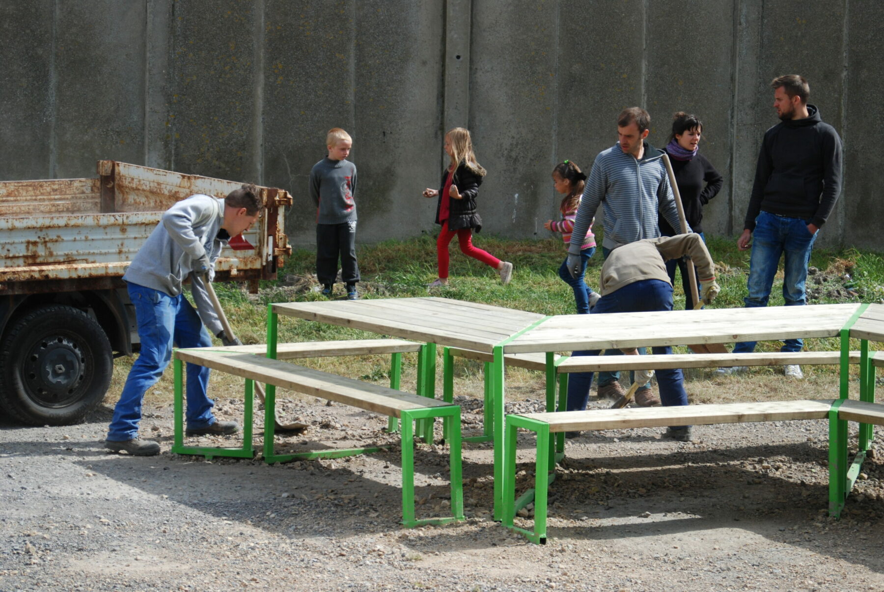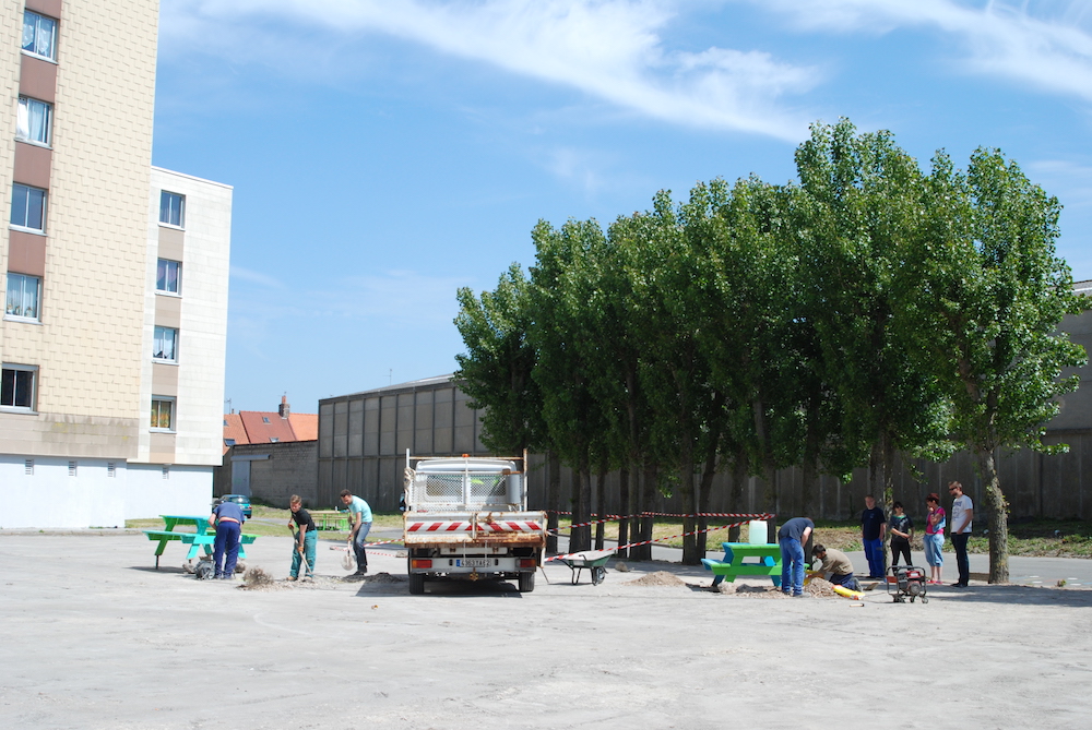 À travers une série de 13 ateliers, nous avons imaginé avec les habitants du Fort Nieulay la transformation de leur pied d’immeuble (zone Carpentier), vaste espace abandonné jusqu’à ce jour. En 4 mois, à raison d’un jour par semaine, les habitants, aidés par les employés des services techniques de la ville, ont conçu et fabriqué du mobilier collectif. Une grande table, pouvant accueillir jusqu’à vingt convives, deux terrasses et un bac à sable sont nés, dessinant ainsi la potentialité de cet espace comme lieu de détente : « une nouvelle plage à Calais ». Les formes des structures ont été inspirées de la vue aérienne de la zone.