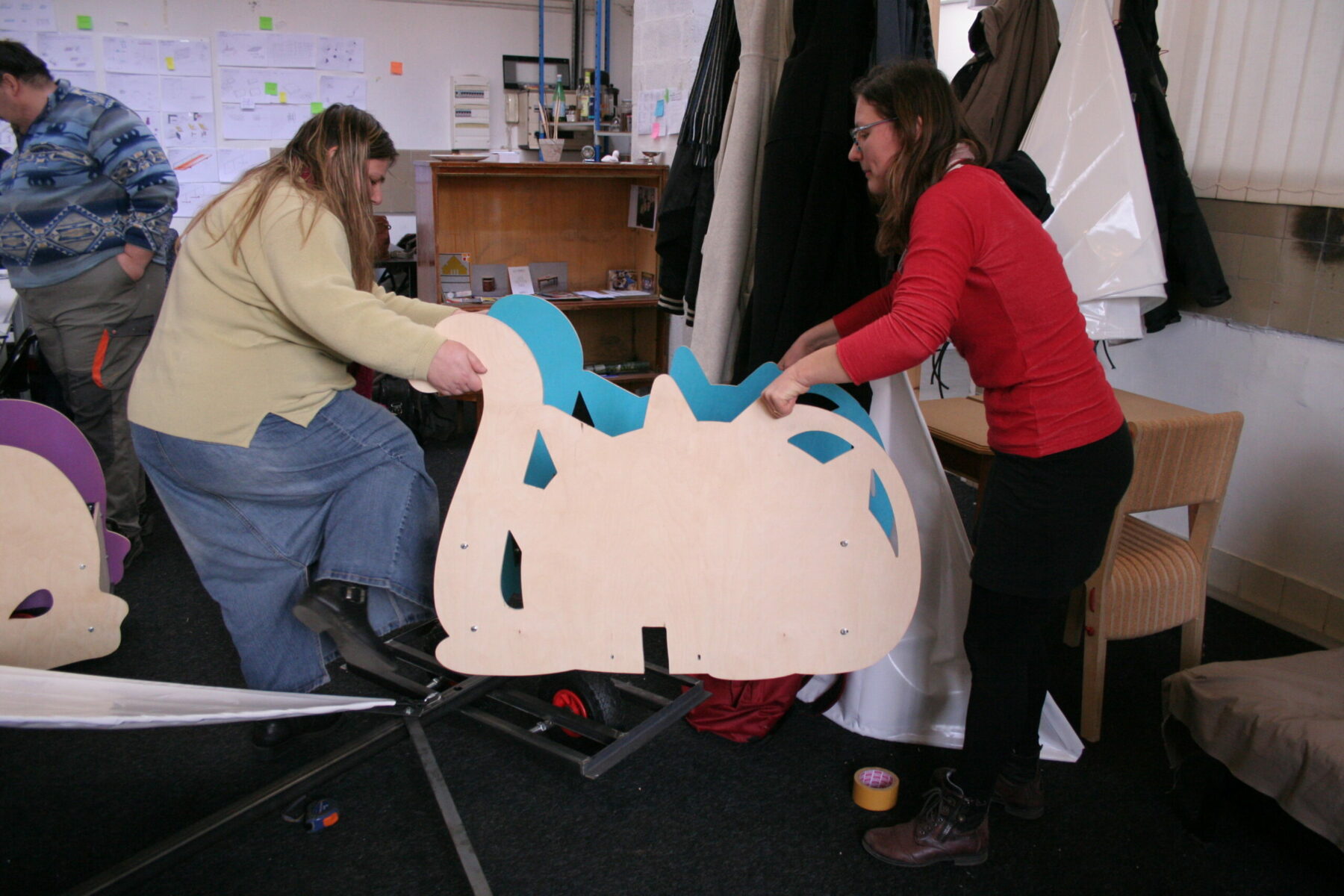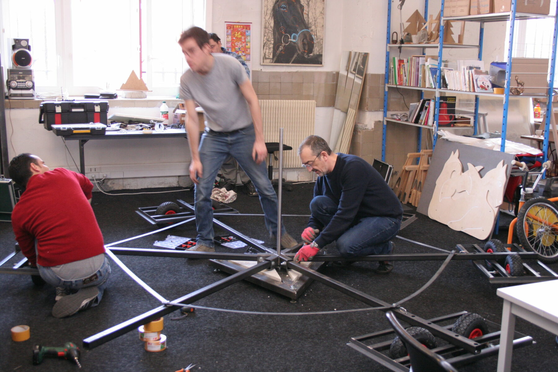 Chaque mardi, Faubourg 132, les éducateurs de Temps de Vie, de Home des Flandres et du Centre social du Pile travaillent avec les papas et mamans bricoleurs à la création de cette machine. Durant ces ateliers participatifs nous choisissons le thème du manège, ses formes, ses couleurs, ses matériaux et sa composition puis nous donnons vie aux idées par le biais de la fabrication.
