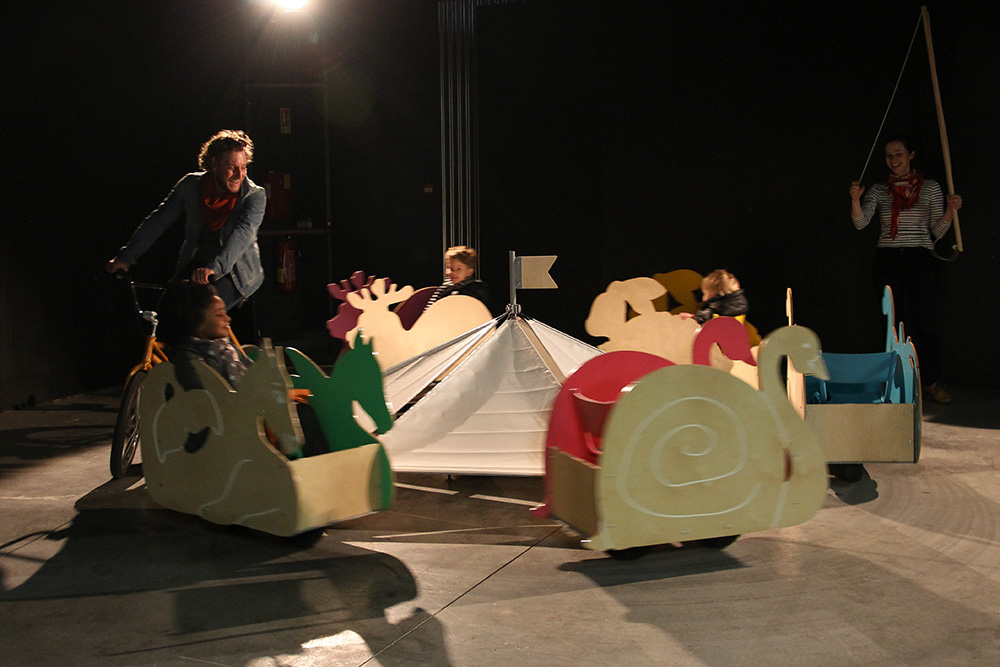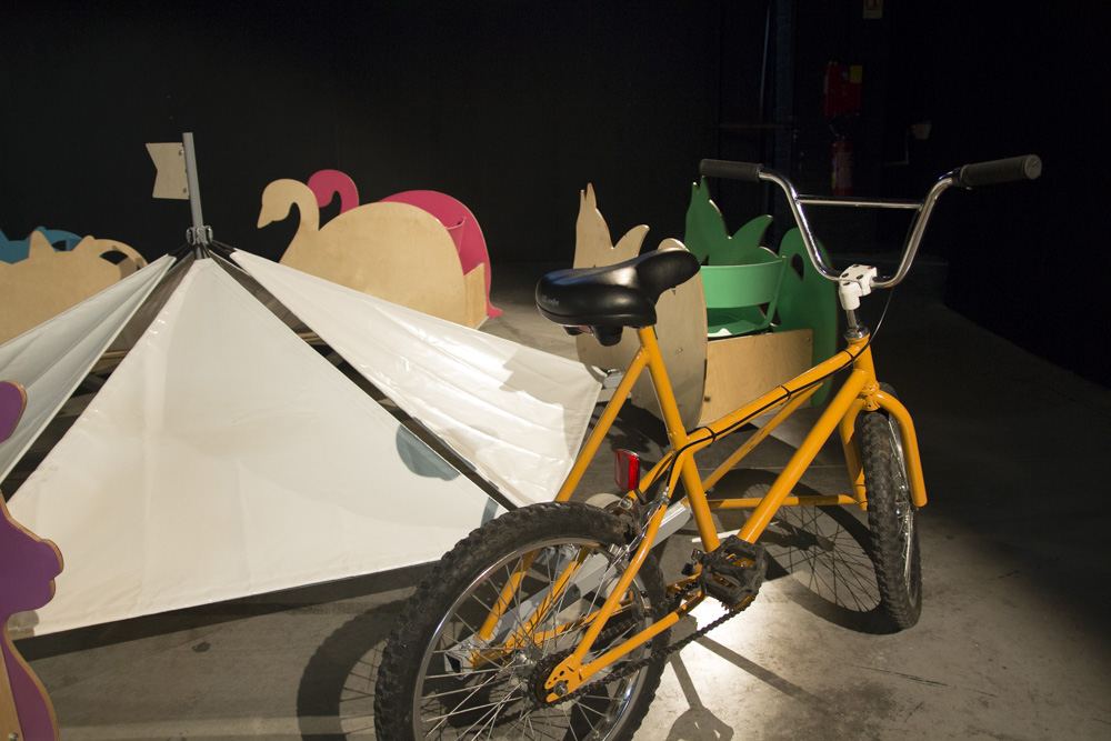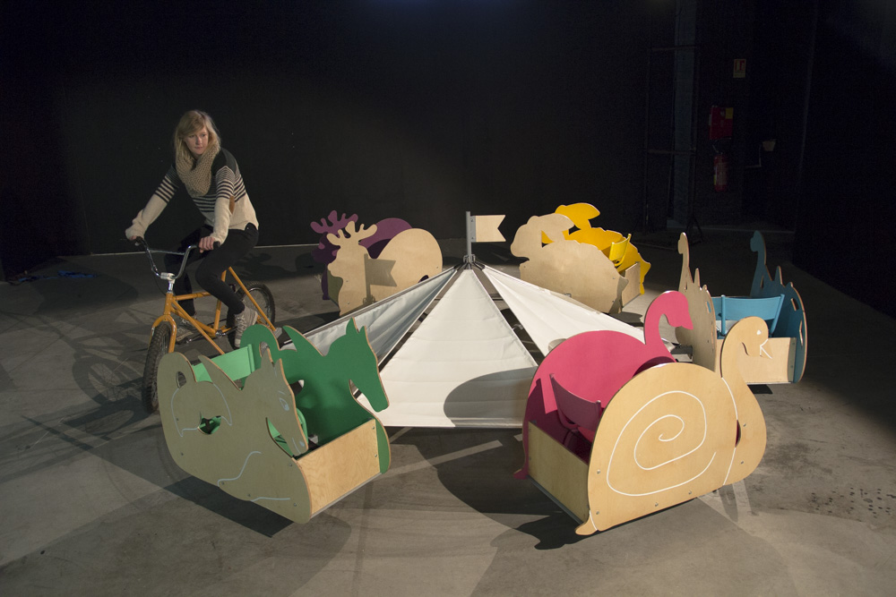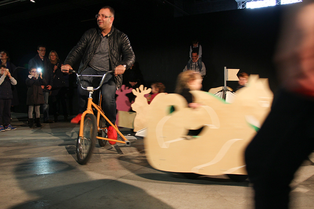 Ensemble, nous avons imaginé un objet animé qui serait mis en mouvement par les parents. L’idée d’un manège est venue assez naturellement. Ce manège sera activé par un vélo, lui-même actionné par un adulte.
