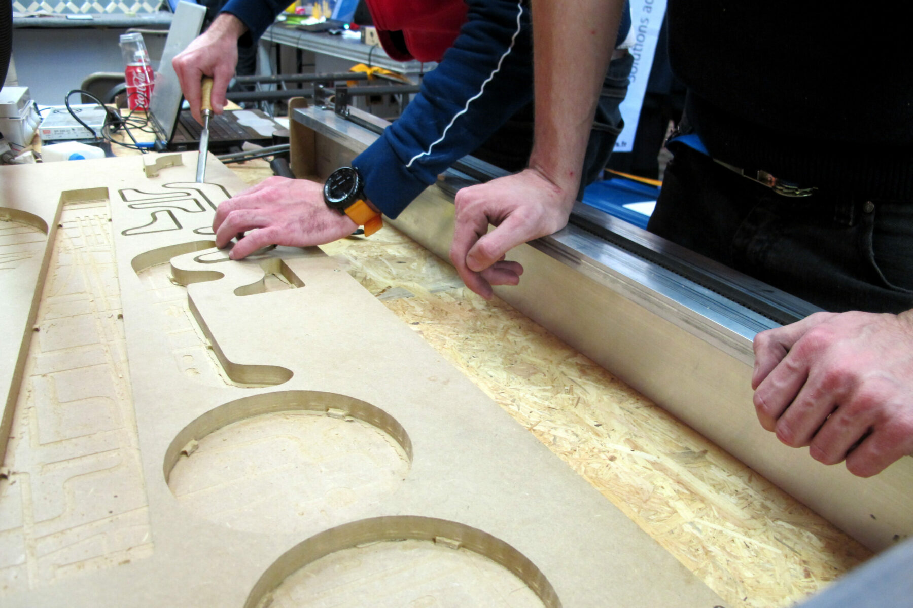 Pour cette occasion, nous avons réparé du mobilier cassé à l’aide de notre fraiseuse numérique artisanale. Cette machine de fabrication numérique (MOCN) nous permet de réaliser des pièces précises répondant parfaitement aux spécificités de chaque objet récupéré.