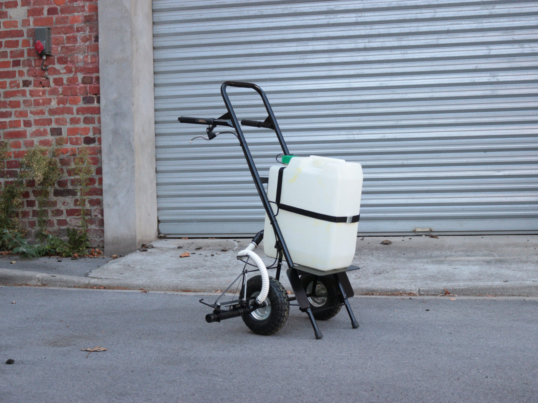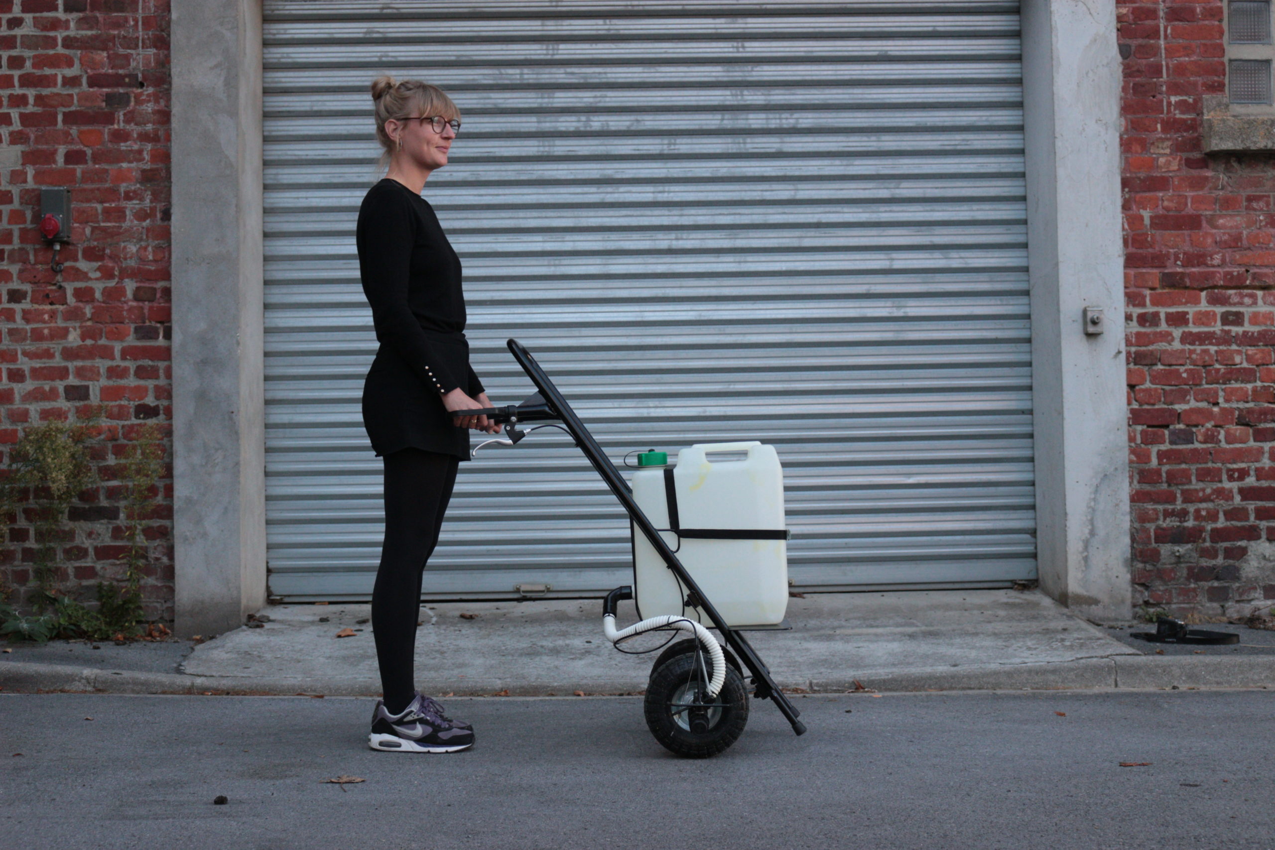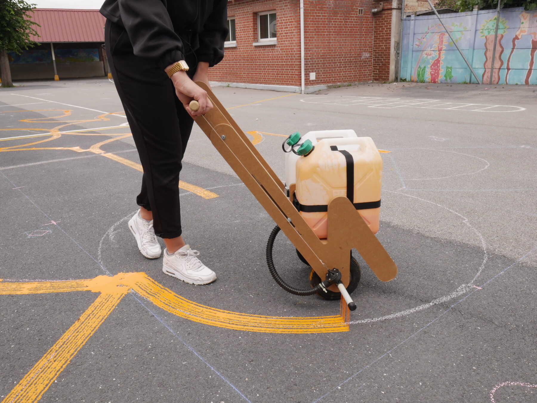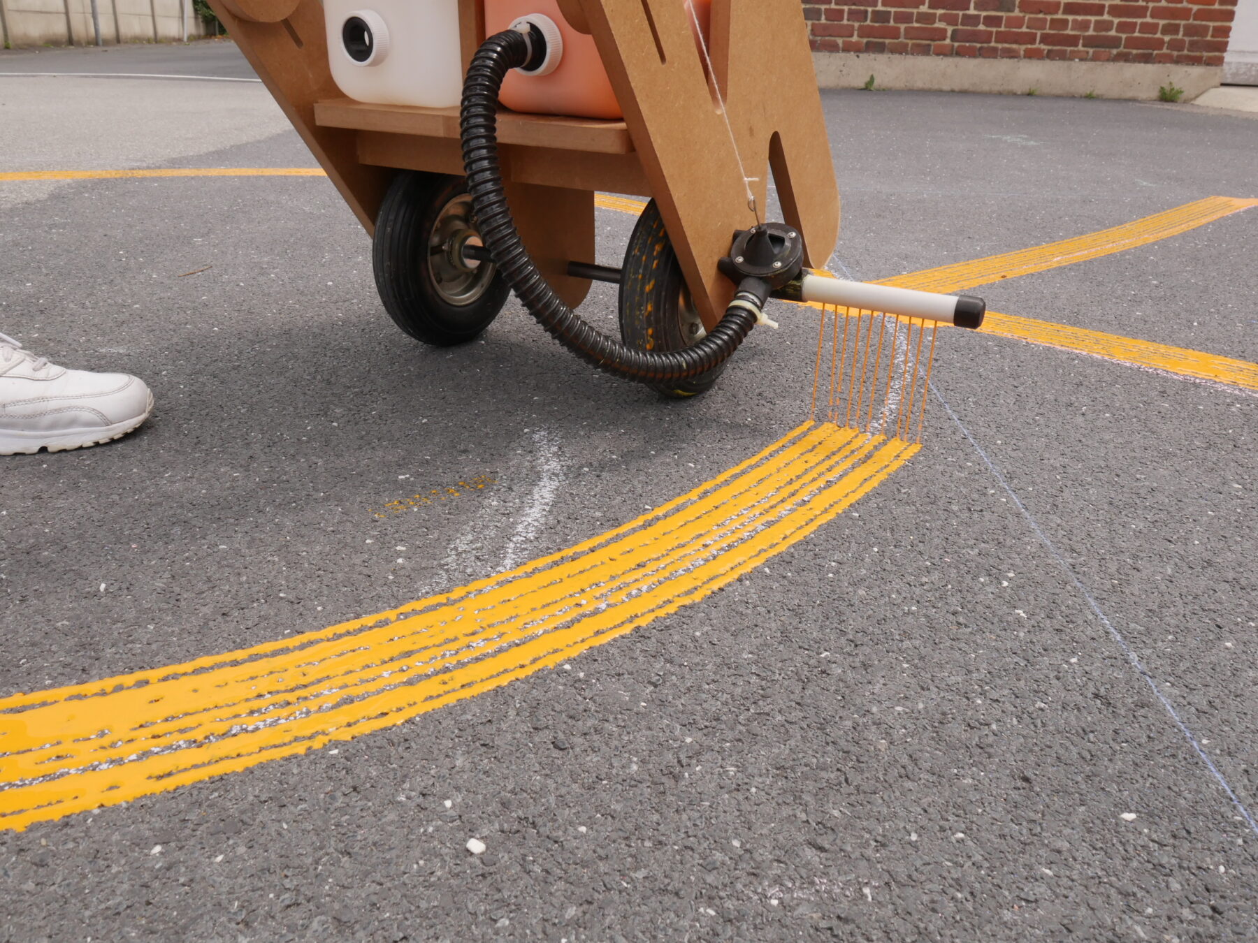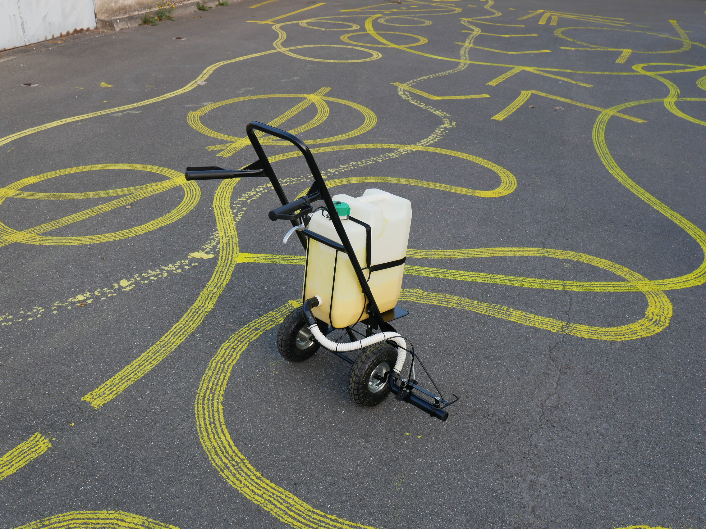 Une fois chargé de gouache, le dispositif permet de tracer au sol lignes, signalétique, typographies, signes, mots, etc. Turbo Traceur invite à concevoir des formes d’expérimentations spatiales, graphiques, interactives et temporaires dans l’espace public.